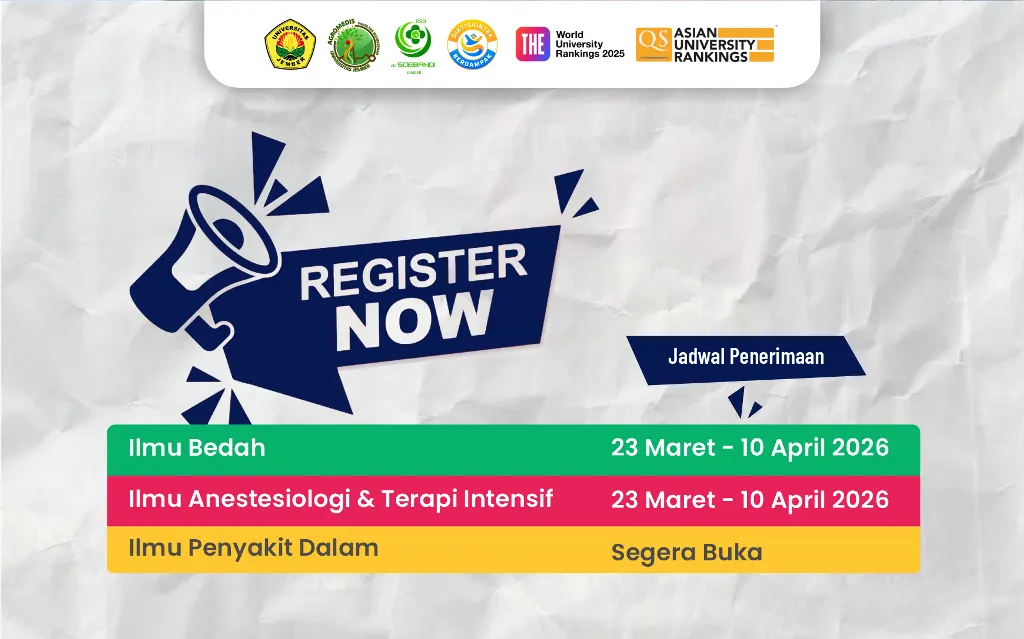 Fakultas Kedokteran membuka kesempatan bagi para dokter untuk mengikuti Program Pendidikan Dokter Spesialis (PPDS) pada Program Studi Ilmu Bedah, Ilmu Penyakit Dalam, serta Ilmu Anestesiologi dan Terapi Intensif sebagai bagian dari komitmen institusi dalam mendukung pengembangan pendidikan kedokteran spesialis yang unggul, adaptif, dan berorientasi pada kebutuhan pelayanan kesehatan masyarakat.