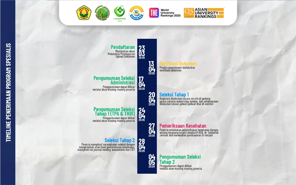 Berikut ini merupakan pilihan program pendidikan spesialis yang tersedia di Fakultas Kedokteran Universitas Jember sebagai bagian dari komitmen institusi dalam mengembangkan pendidikan kedokteran lanjutan yang berkualitas.